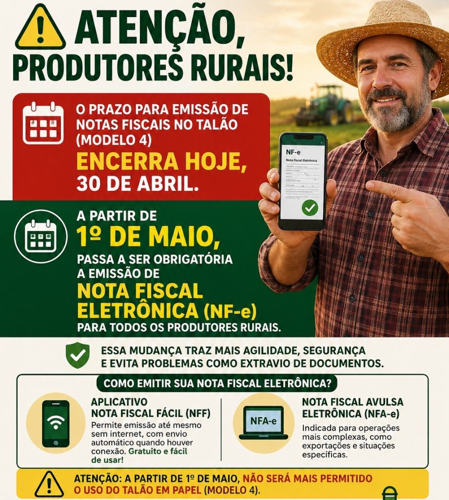 A partir de 1º de maio, passa a ser obrigatória a emissão de Nota Fiscal Eletrônica (NF-e) para todos os produtores rurais.