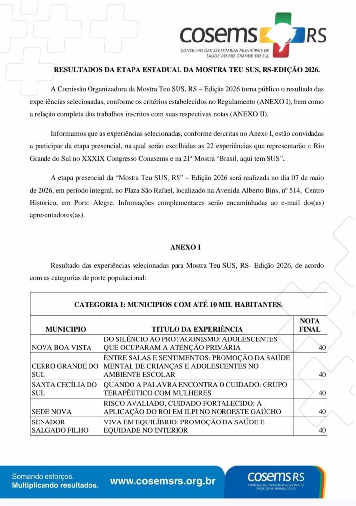 No dia 10 de abril, foi divulgado o resultado final da etapa estadual da Mostra Teu SUS 2026, e temos uma grande notícia: nosso trabalho foi selecionado! ????
