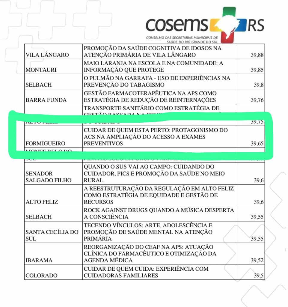 Agora seguimos para a próxima etapa: a apresentação em Porto Alegre, no dia 07/05, onde serão escolhidos 22 trabalhos que irão representar o município de Formigueiro e o Estado na 21ª Mostra “Brasil, Aqui Tem SUS”.
